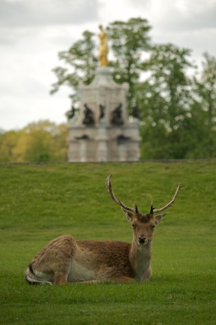 A deer in Bushy Park, posing in front of the Diana Fountain.