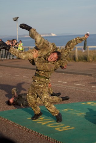 Some marine commandos give an unarmed combat demonstration at the Bournemouth Air Festival. In wrestling they’d call that a back body drop; no idea if there is a more technical term for it.