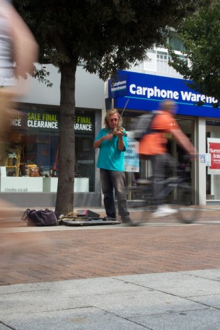 A busker plays in Kingston-upon-Thames as the world moves around him.