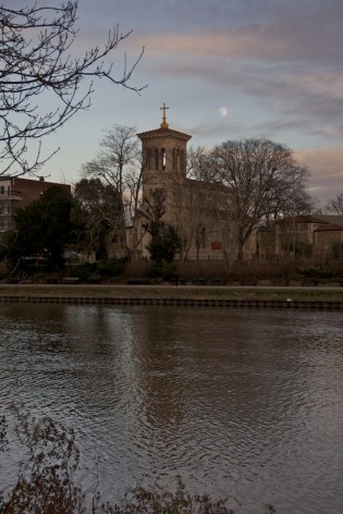 A church near Kingston sits majestically alongside the Thames at twilight, with the Moon in the sky behind it.