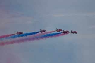 Reds 1 – 5 of the Red Arrows, collectively known as Enid, fly in trailing red and blue smoke as they prepare to make another manoeuvre.