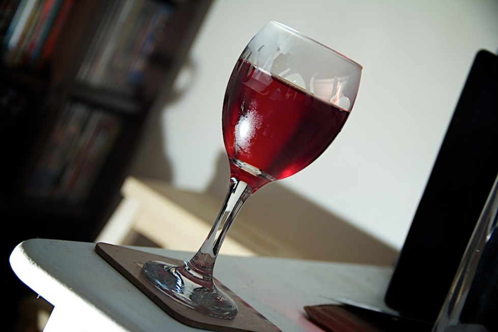 A shot of some really very nice cherry wine from the good people at the Lyme Bay Winery. I was playing about with a flashgun at this point, so the glass is lit by an off-camera flash, highlighting the condensation on the glass.