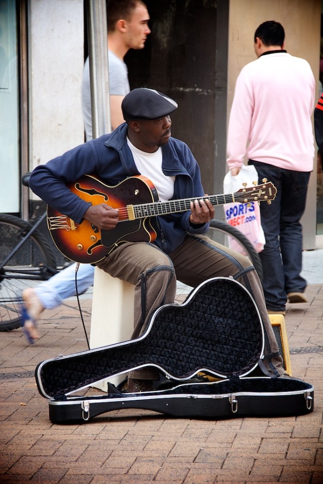 A busker plies his trade in Kingston town centre.