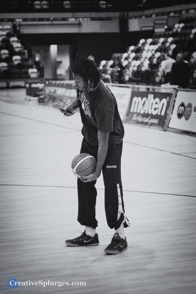 One of the players of the London Lions basketball team does some of their pre-game prep before a match.
