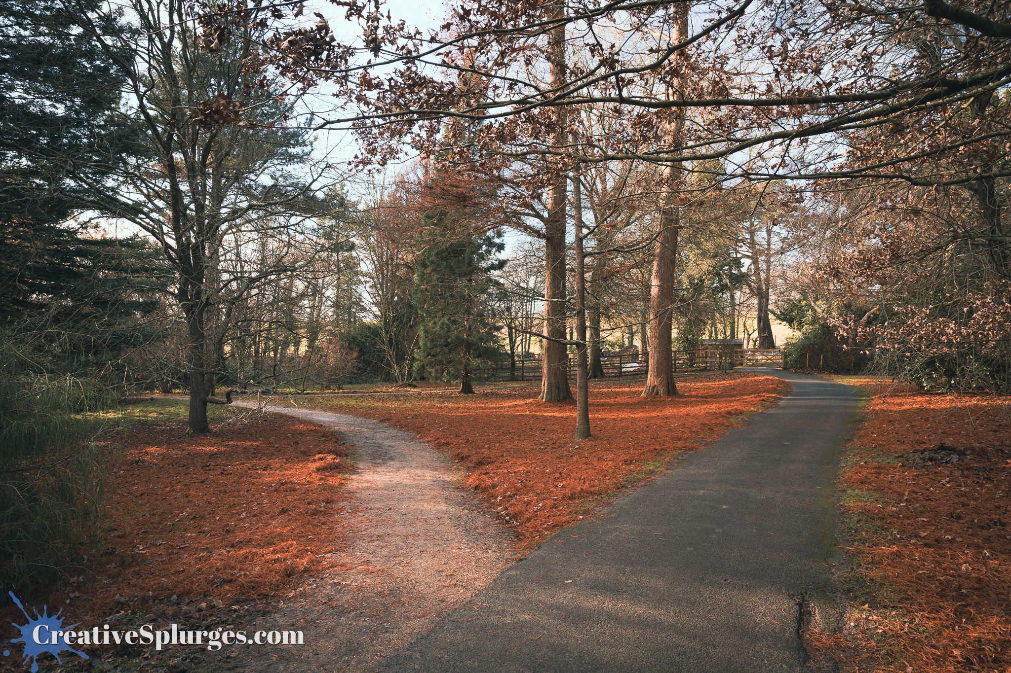 The grounds of Sheffield Park and Gardens covered in a golden smattering of leaves.