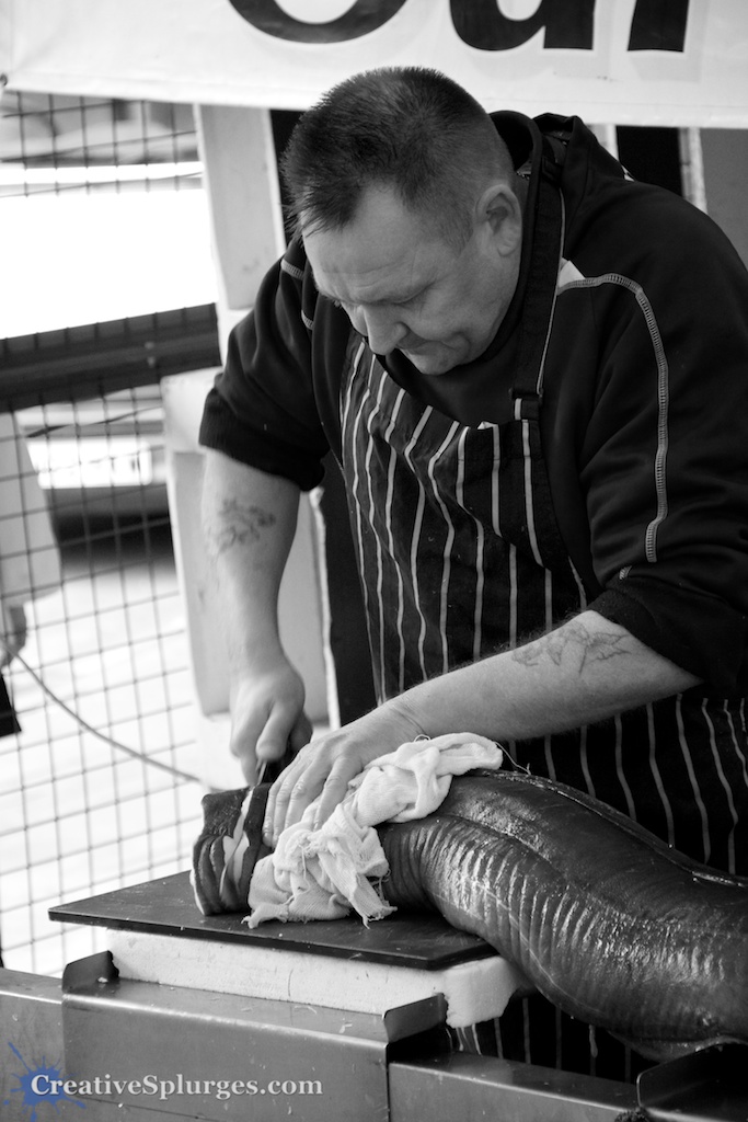One of the traders at Borough Market cuts up what I assume is a fish or an eel. Or, perhaps, a basilisk.