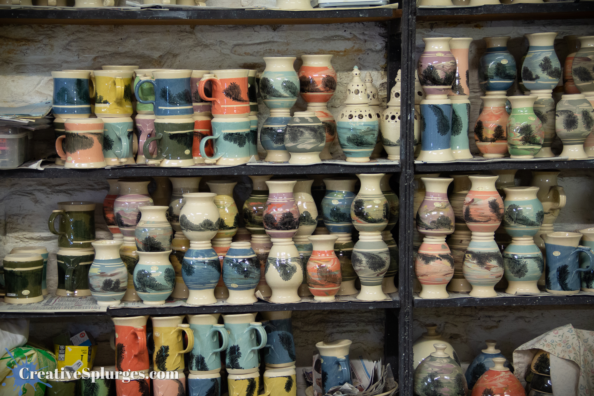 A bunch of pots and cups and mugs backstage at Boscastle Pottery in Cornwall.