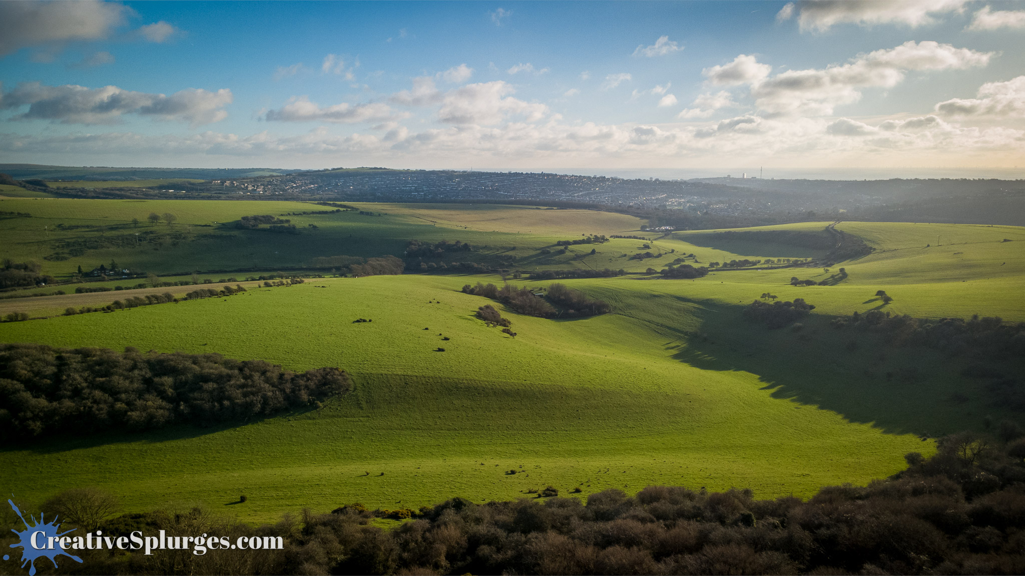 A shot of the South Downs, looking towards Brighton from the Chattri war memorial, taken from a drone.