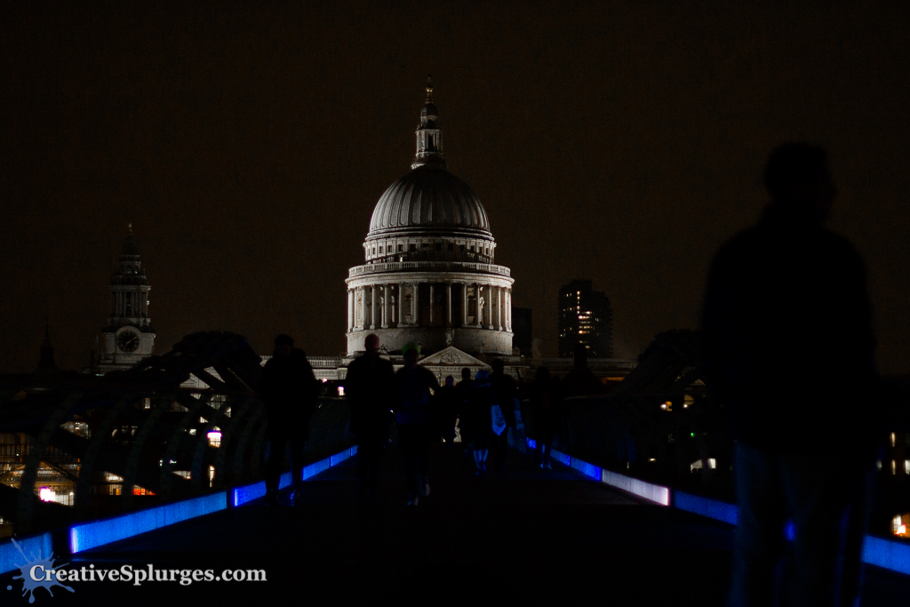 A shot looking across the Millennium Bridge towards St Pauls, taken at night, when it was dark.