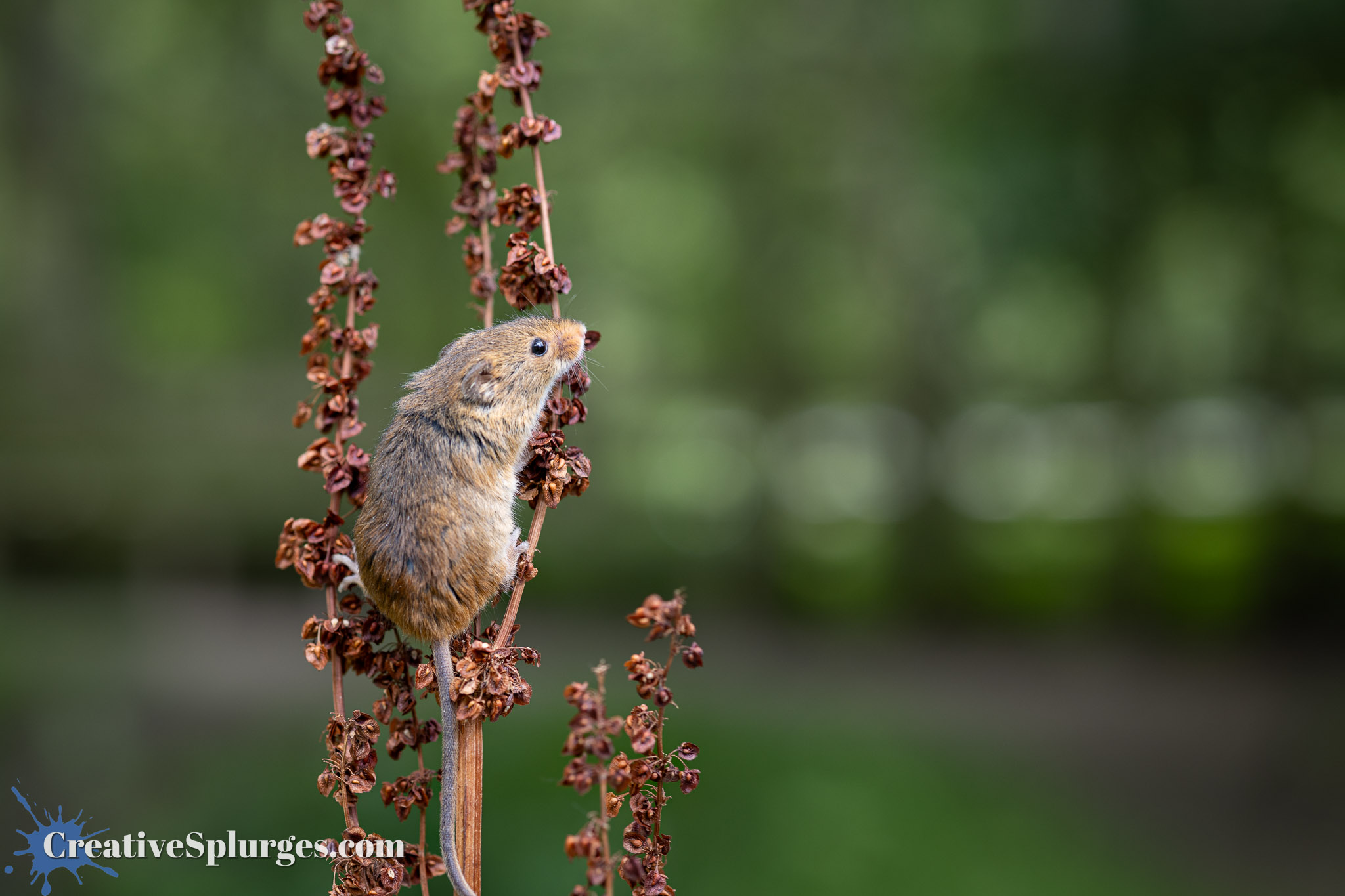 A dormouse, sitting nervously on a plant whilst a bunch of photographers take his picture.