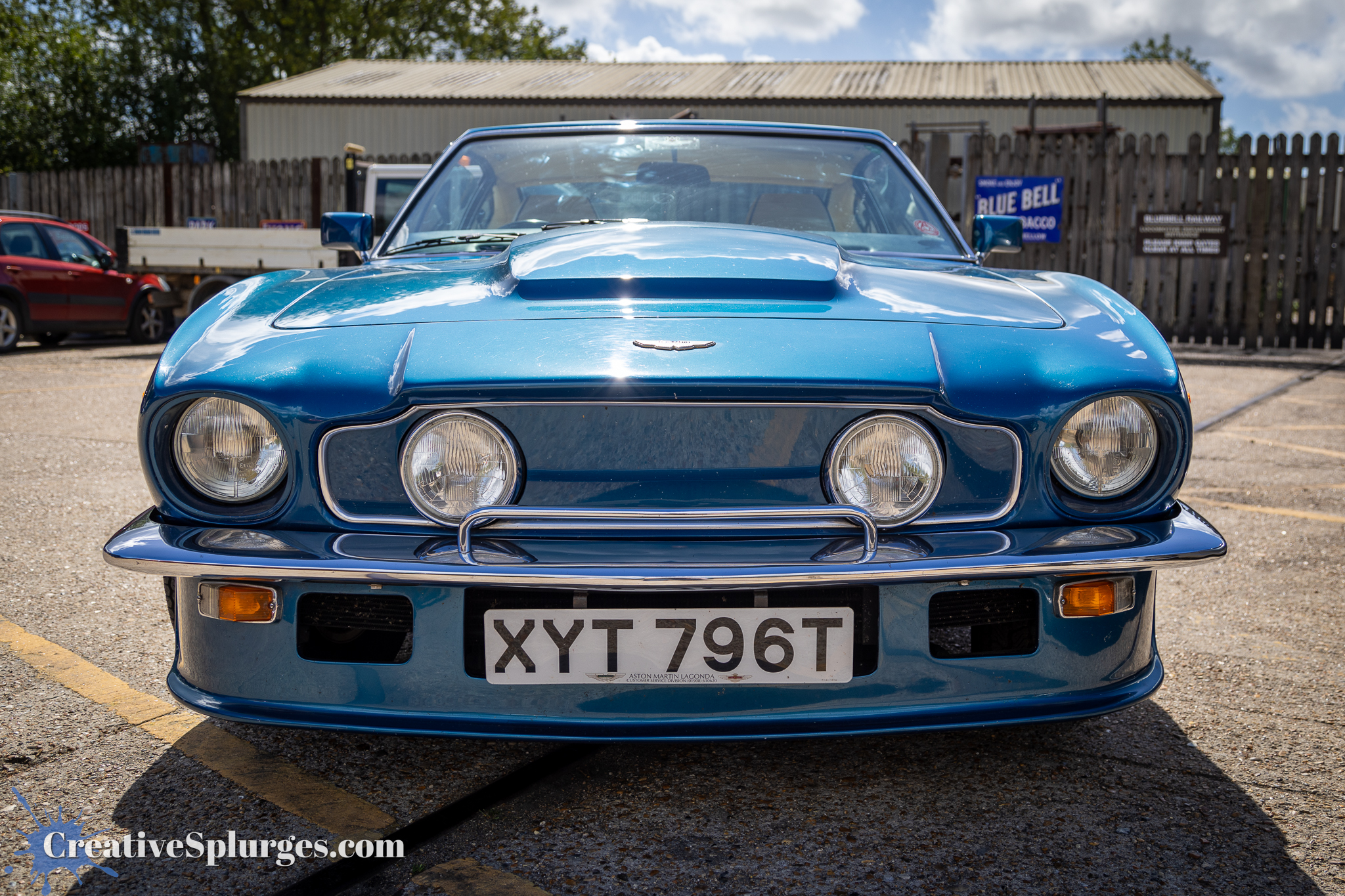 The lovely front grille of a 1980s Aston Martin Vantage, in a beautiful blue.